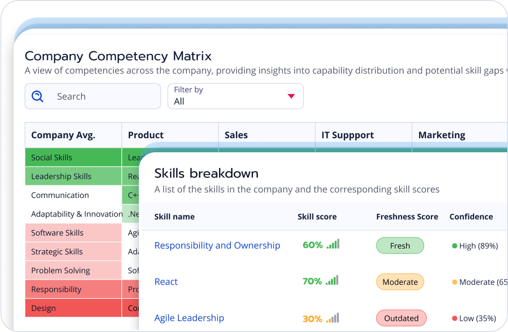 Instantly pinpoint where your team's collective skills are strong and where they are weak, giving you a clear picture of your talent landscape.